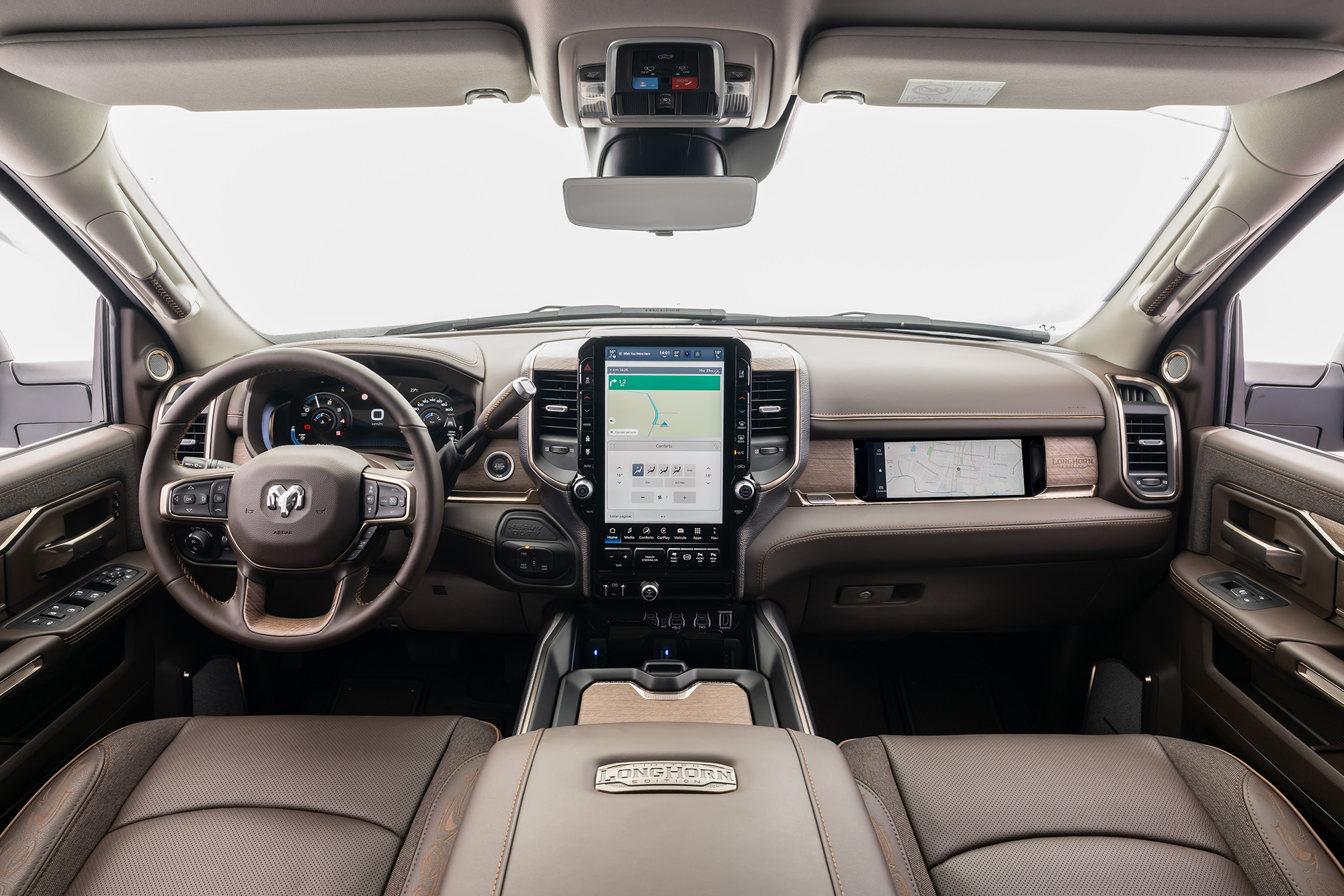 No topo da gama, a 3500 Limited Longhorn aposta no luxo extremo, com acabamento em madeira legítima e couro trabalhado. Traz ainda retrovisor digital 3.0, tela exclusiva de 10,25” para o passageiro dianteiro, câmeras auxiliares para reboque e recursos que facilitam manobras, como o assistente de ré autônomo para trailers.