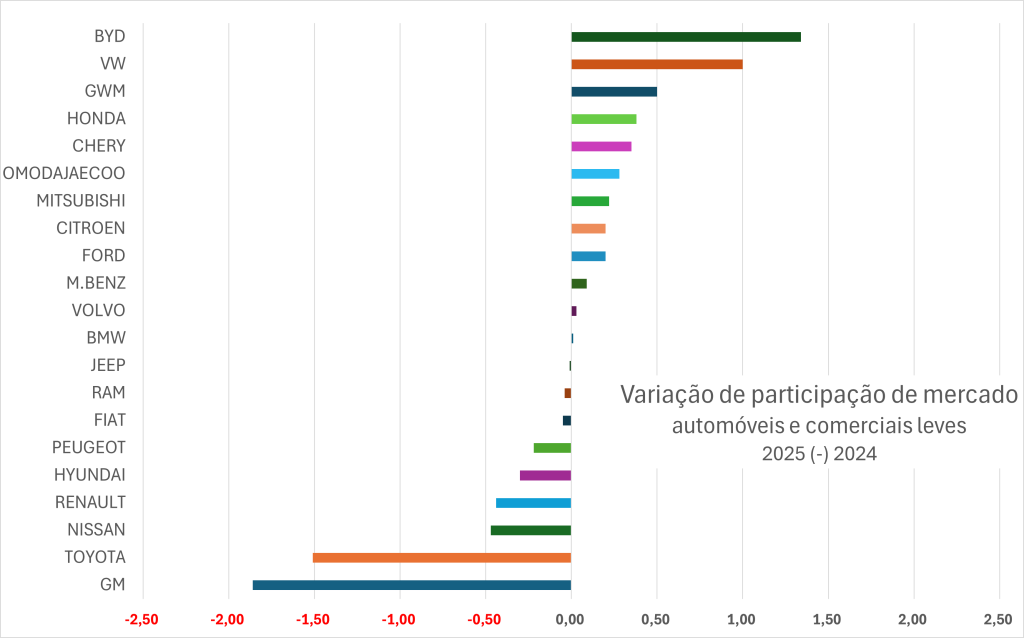Quando se observa quem ganhou e quem perdeu participação de mercado em 2025, fica evidente que marcas concentradas em veículos híbridos e elétricos tiveram melhor resultado.