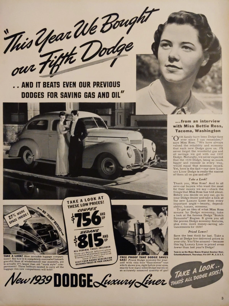 Vintage Dodge anúncio impresso de automóvel, Bettie Ross Tacoma Washington