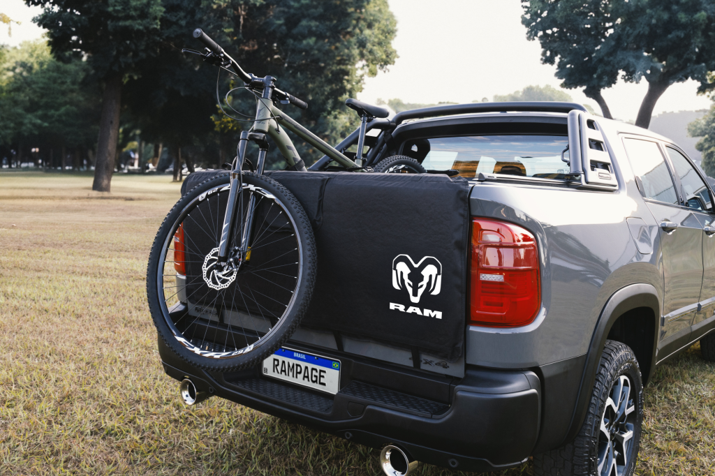 A Ram Rampage pode ser equipada com engate reboque, suportes para duas ou três bikes via engate, capa transbike e o versátil extensor de caçamba, que também funciona como rampa e divisor de carga.