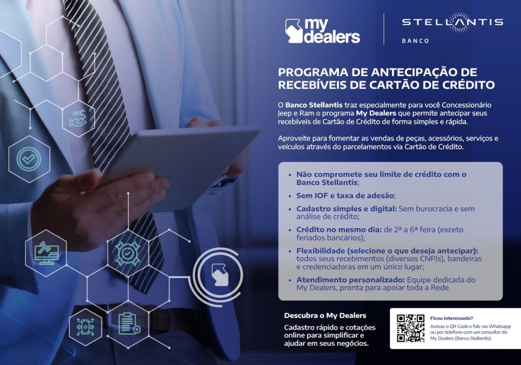 O Banco Stellantis desenvolveu o programa My Dealers para oferecer à rede de concessionárias das marcas que integram a Stellantis uma solução de crédito rápida, segura e de baixo custo. O objetivo é democratizar o acesso à antecipação de recebíveis de cartão de crédito, dando às concessionárias mais autonomia sobre seu fluxo de caixa e permitindo que reinvistam com agilidade em suas operações.