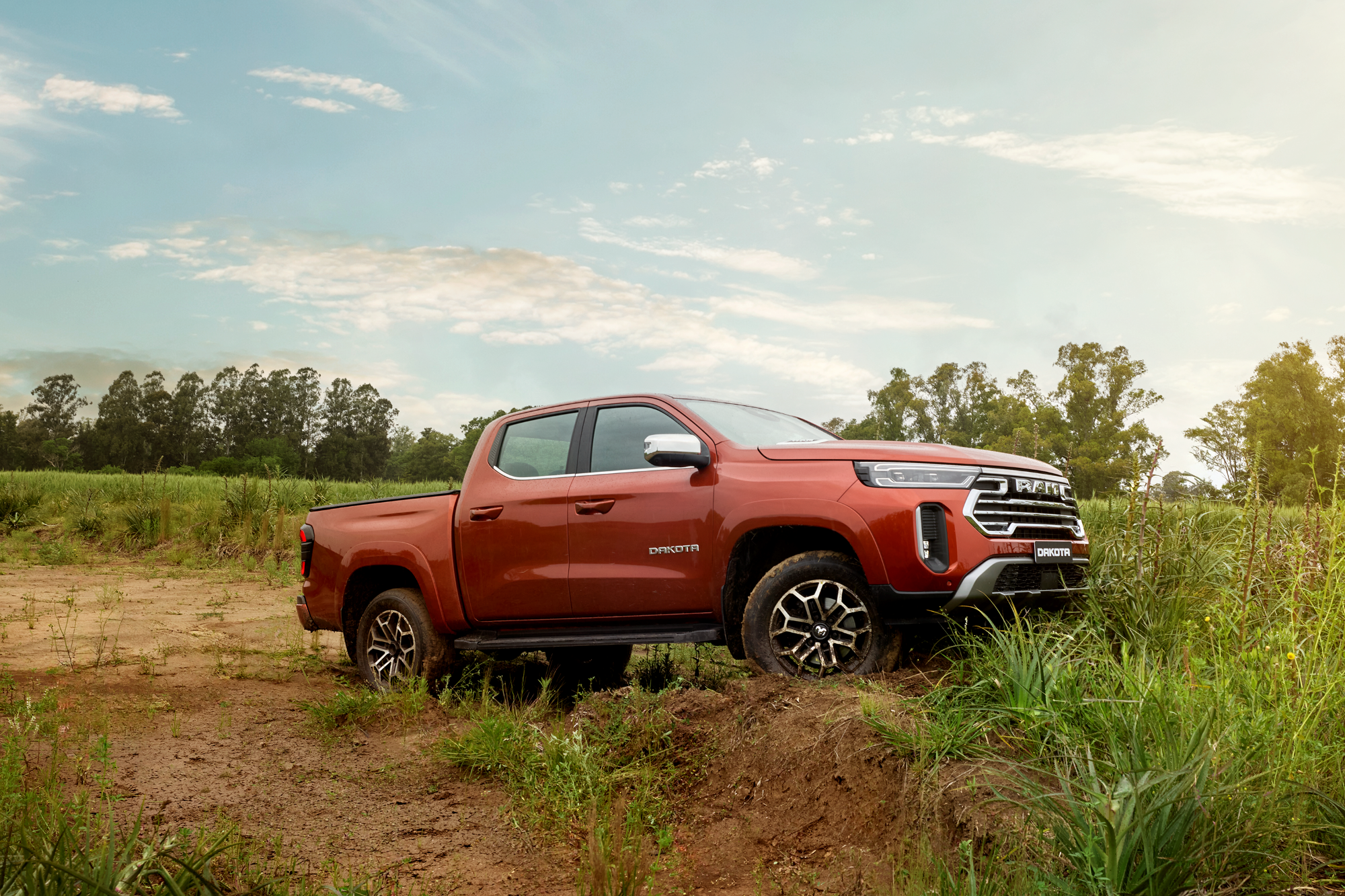 Em desempenho, a Dakota Laramie é equipada com motor 2.2 Turbodiesel de 200 cv e 450 Nm de torque, aliado ao câmbio automático de oito marchas. A tração 4×4 Auto distribui força automaticamente entre os eixos, complementada pelos modos 4×2, 4×4 reduzida, bloqueio de diferencial traseiro e assistente de descida.