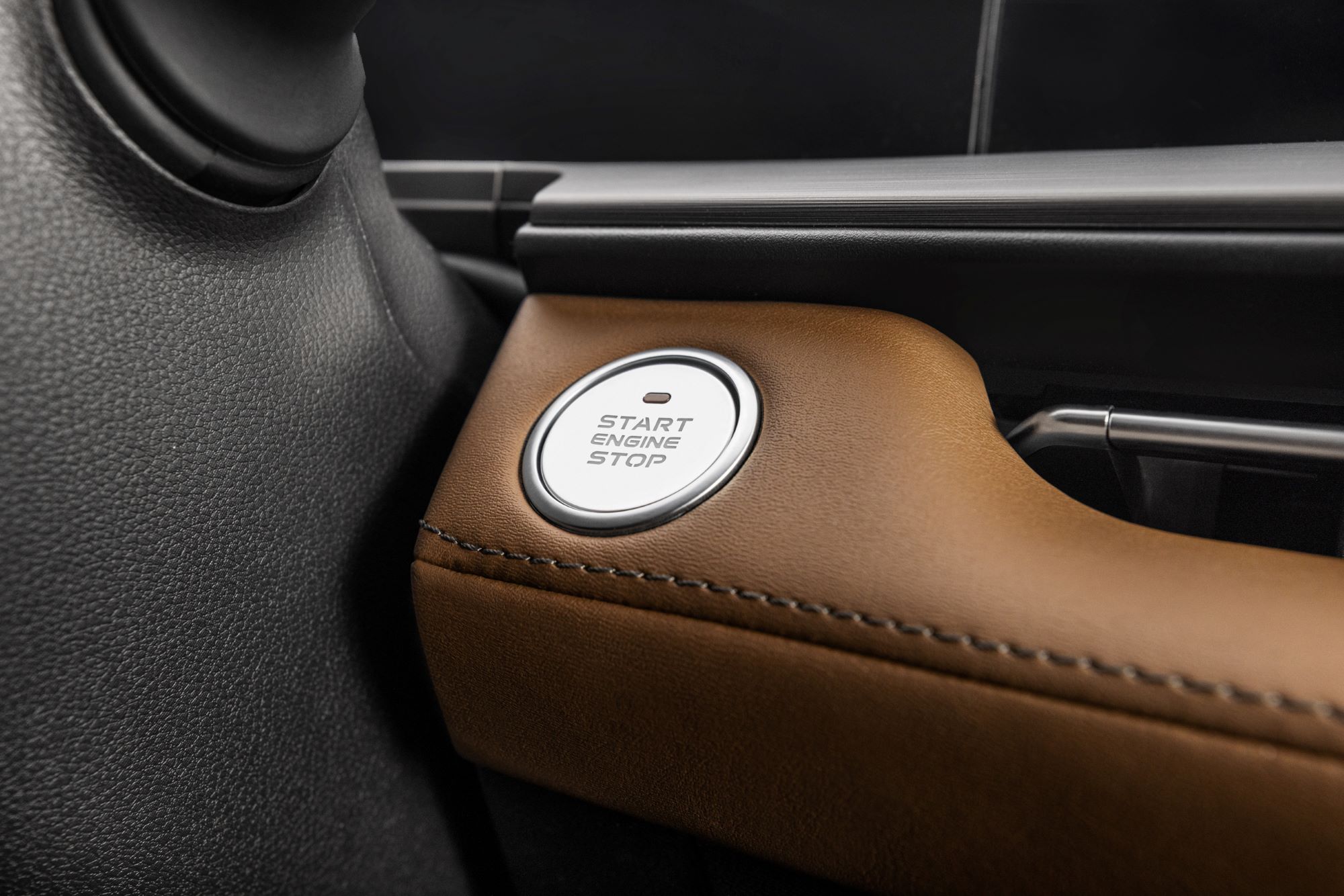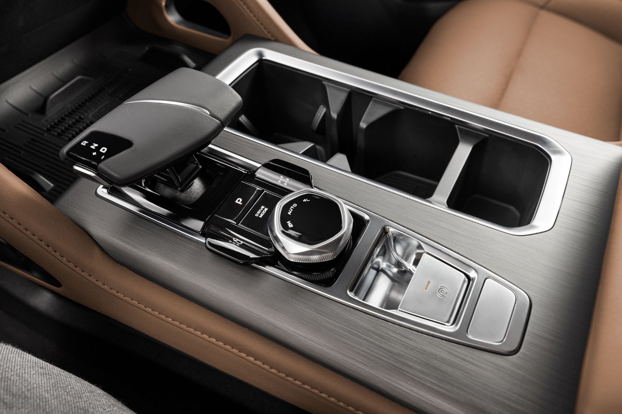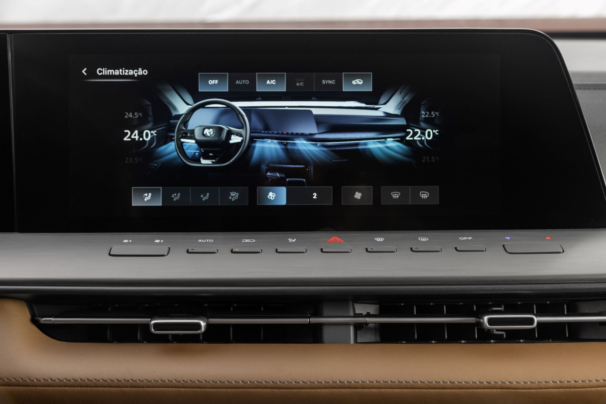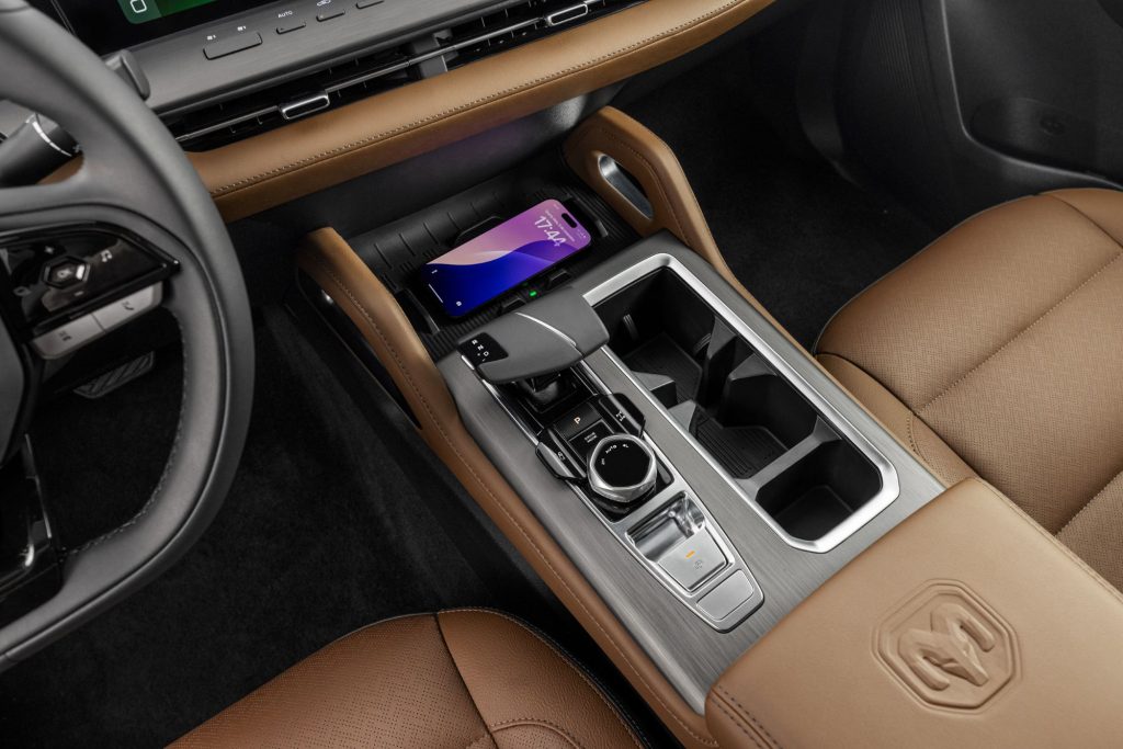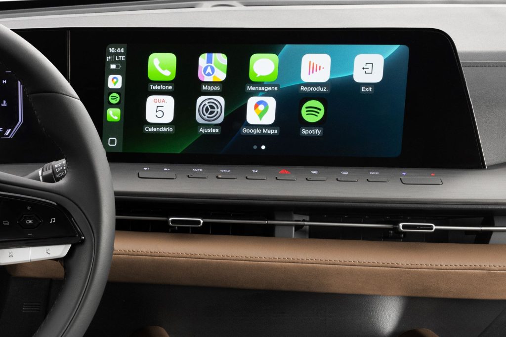 O interior segue o padrão de refinamento da marca, com bancos revestidos em couro premium marrom e painéis com materiais macios ao toque. O console central em dois níveis acomoda porta-copos, porta-objetos, entradas USB — incluindo tipo C — e tomada 12V, organizando ergonomia e tecnologia.