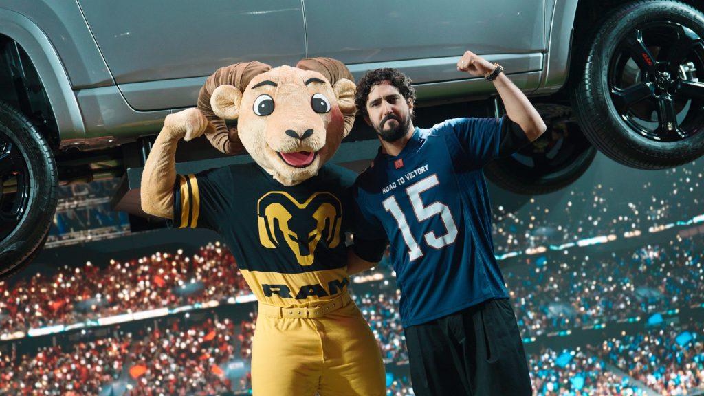 Embaixador da Ram no Brasil, o ator Renato Góes participa de ação da marca durante jogo da NFL, ao lado de Ramiro, mascote oficial