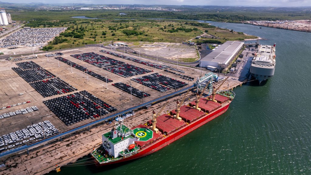 Vista aérea mostra o navio Dover Highway (K-Line), reservado exclusivamente para a Stellantis para o embarque de carros via Porto de Suape com destino à Argentina