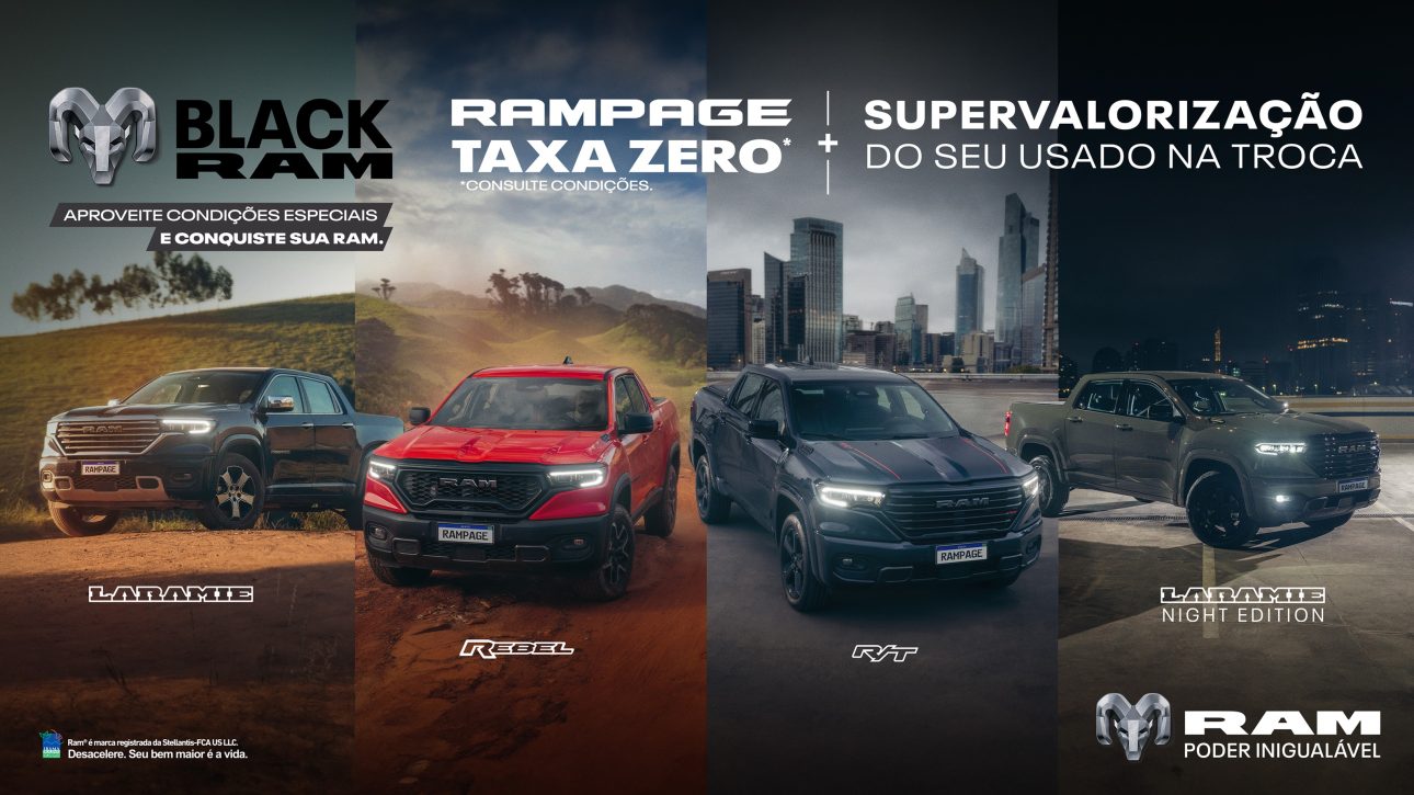 A Black Ram acontece em 8 de novembro nas concessionárias da marca, com condições exclusivas para adquirir picapes Ram zero quilômetro, incluindo taxa zero, IPVA e emplacamento grátis.